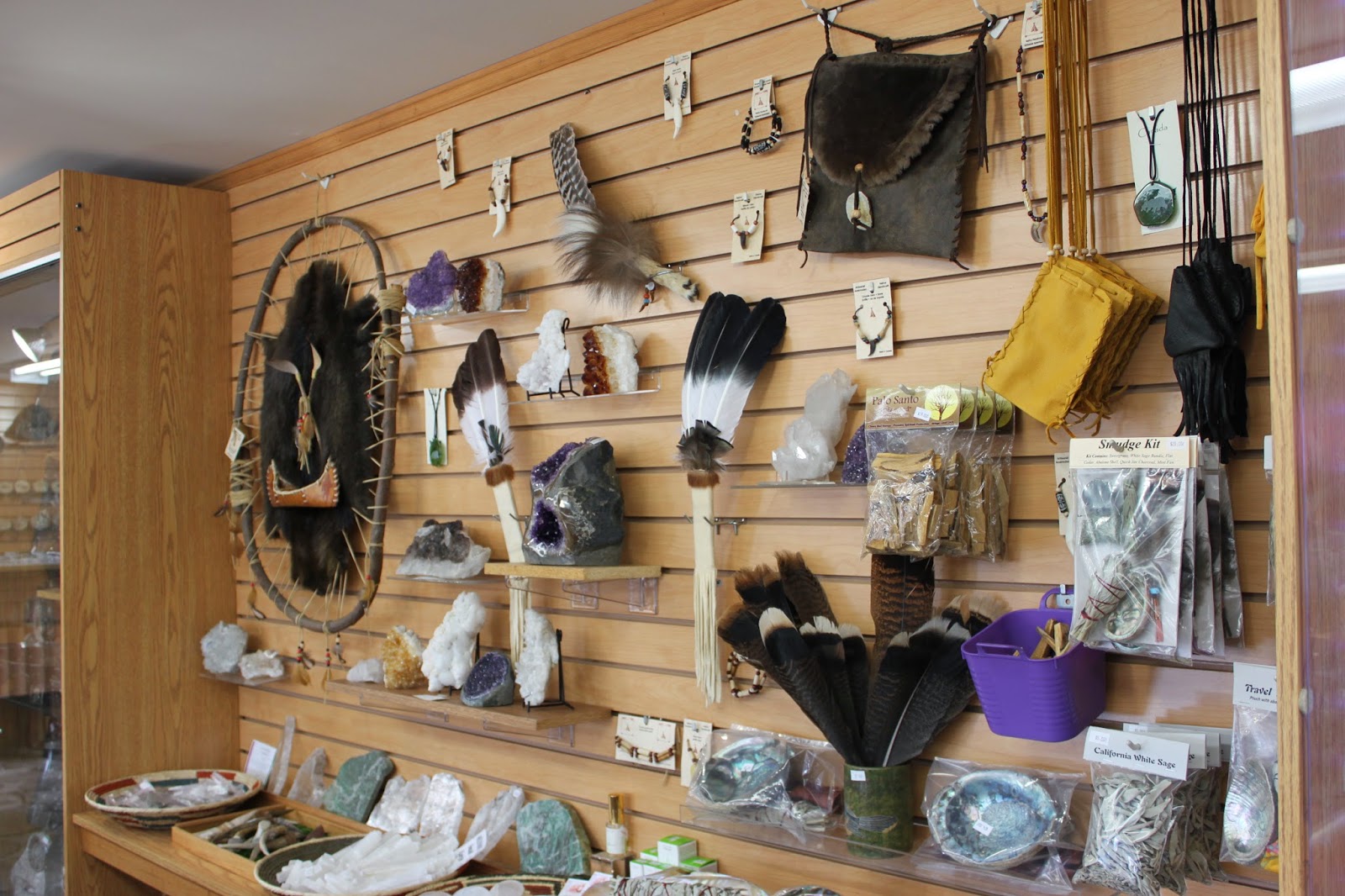 Display case of healing stones, rock/mineral books and other accessories.